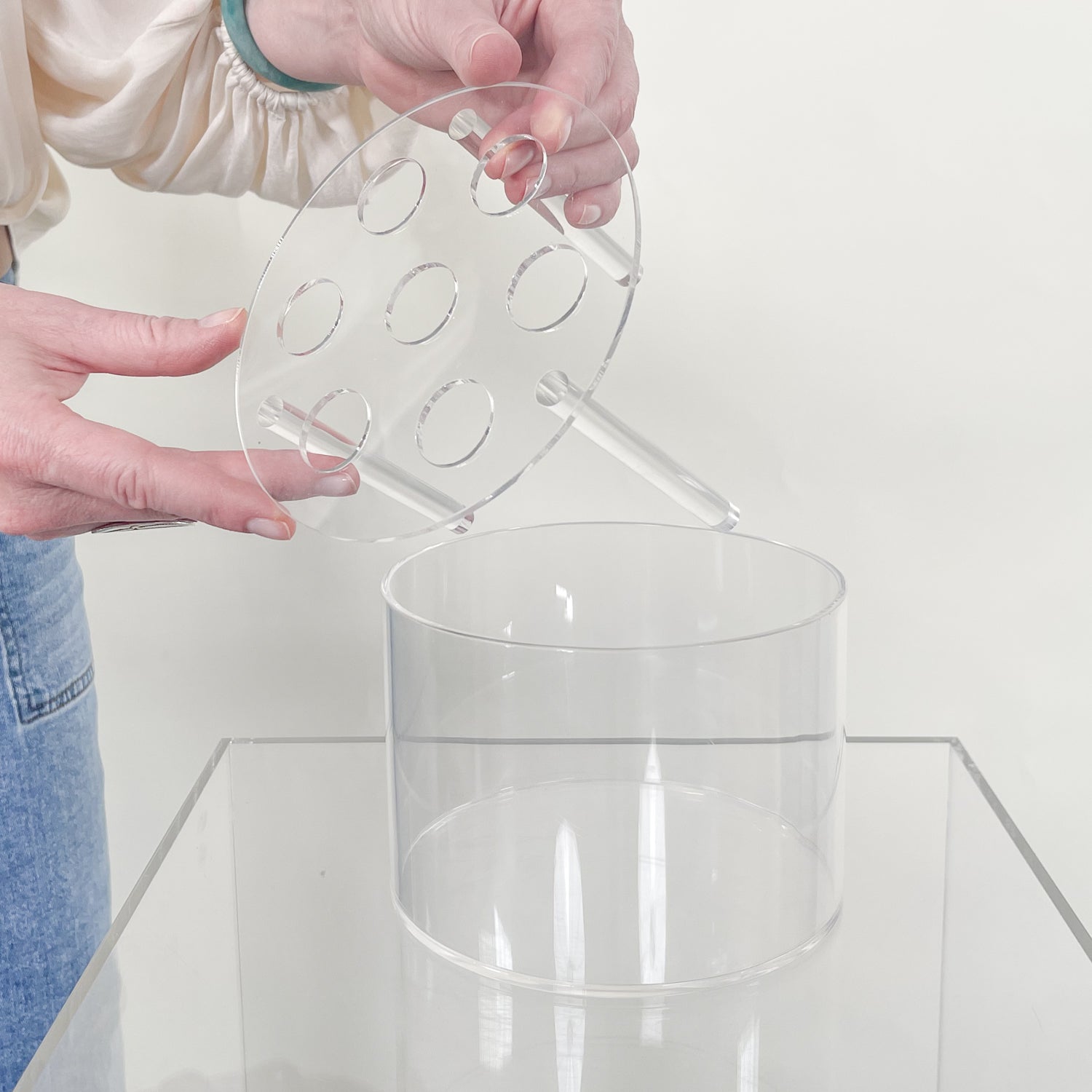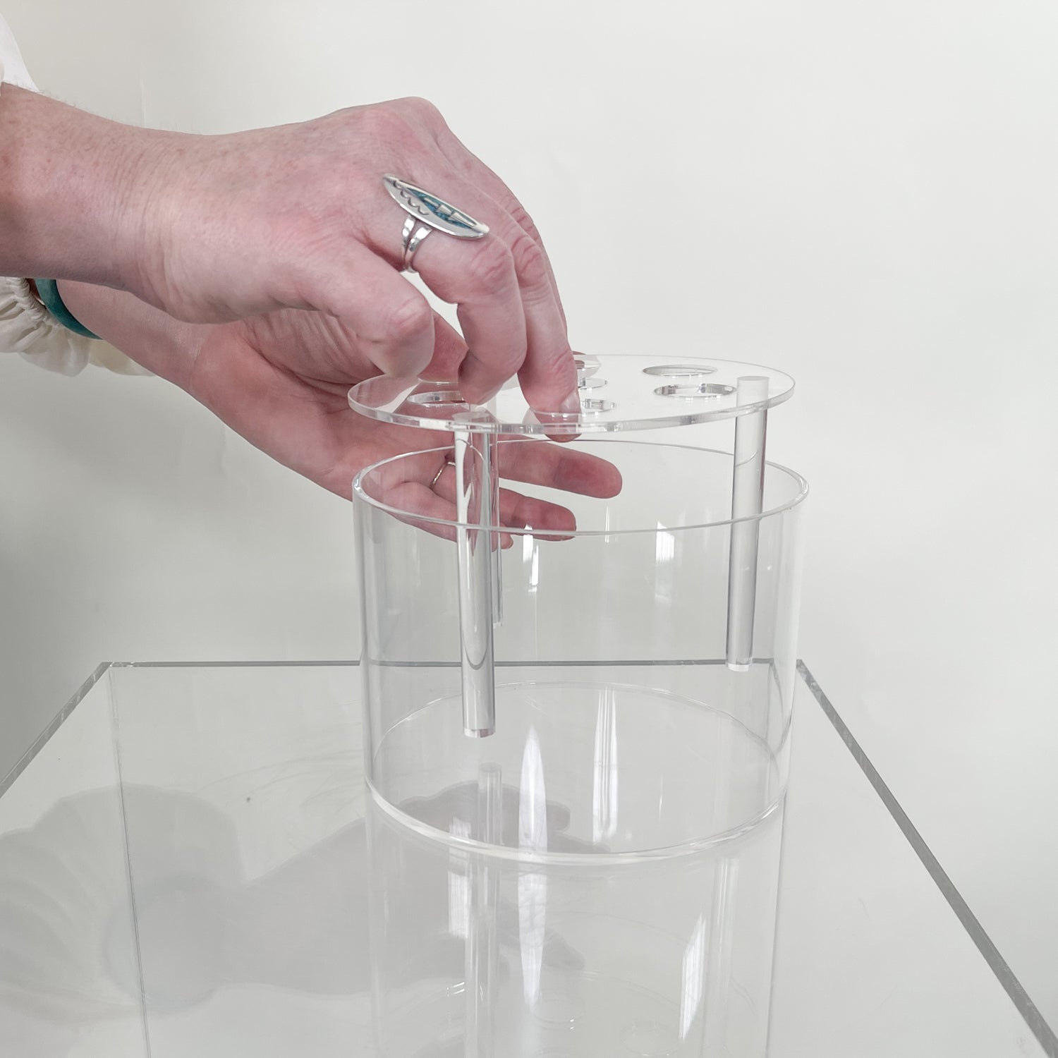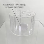 Our eco-friendly, foam-free clear acrylic centerpiece vase is sturdy, inexpensive, reusable, and PERFECT for all DIY wedding flowers! This round, clear acrylic vase is a beautiful and mechanic-free option for your tables. The acrylic vase is 6 inches wide and 4 inches tall.