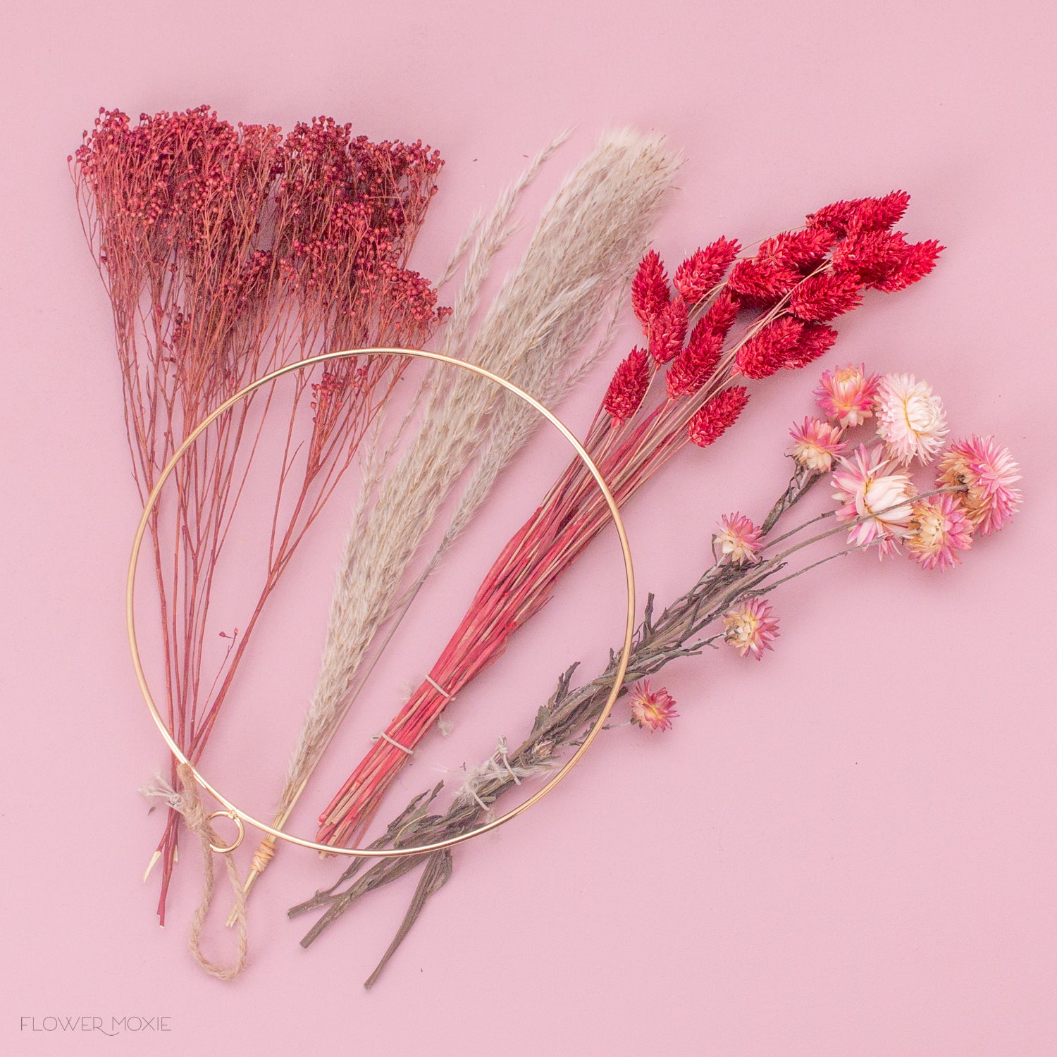 This fun DIY box contains a variety of dried flowers and one gold ring to make your own dried floral wreath! We recommend attaching your dried flowers with wire, such as gold bullion wire, and arranging in an asymmetrical fashion for a unique and fun addition to your home decor!