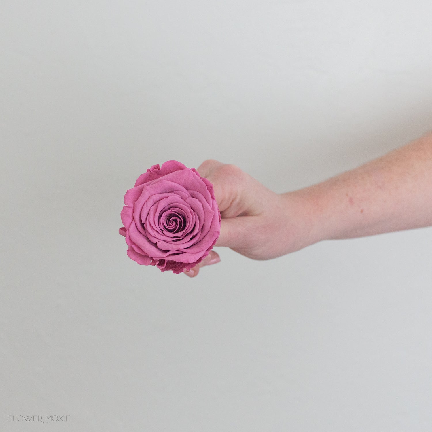 Preserved roses look just like fresh roses, have a consistent color, and are a stunning addition to any arrangement! Preserved violet pink roses are durable, easy to work with, can be purchased in advance of your event, and can be saved as a sentimental keepsake.